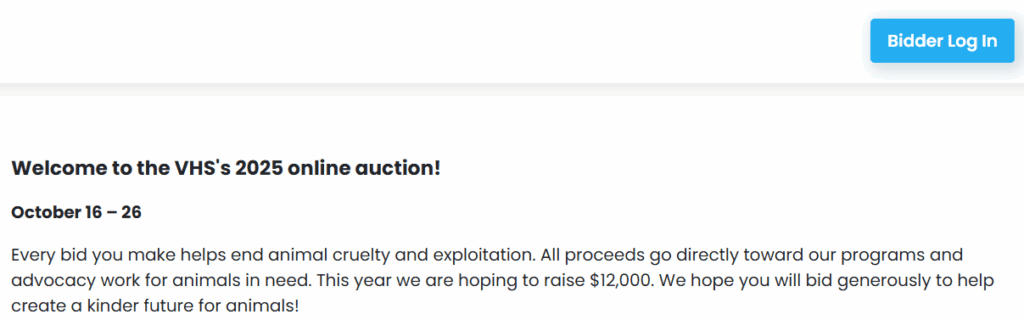 This year’s auction aims to raise more than $12,000 and we can’t do it without you! All proceeds from the auction will go towards the VHS’ work to advocate for animals.